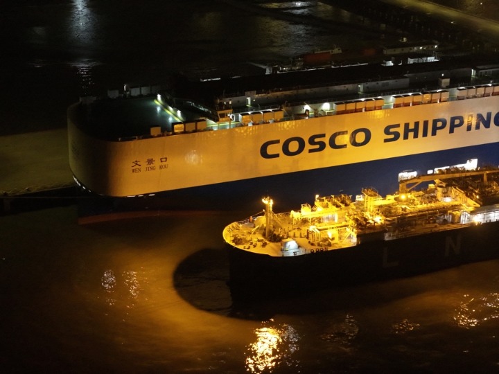 3月25日晚至26日早晨,在上海港外高桥港区海通码头,上港集团能源公司为远海汽车船“文景口”轮进行液化天然气(LNG)加注作业。这是“长江首单”保税LNG“船-船”同步加注,预计加注LNG约2400立方米,作业流程严格遵循国际标准和环保要求,展现上海港LNG加注技术。