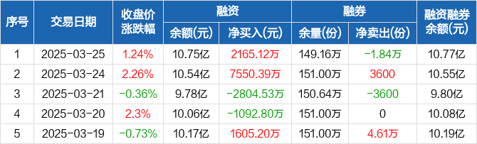 融资方面,当日融资买入3.85亿元,融资偿还3.63亿元,融资净买入2165.12万元。融券方面,融券卖出0份,融券偿还1.84万份,融券余量149.16万份,融券余额170.79万元。融资融券余额合计10.77亿元。
