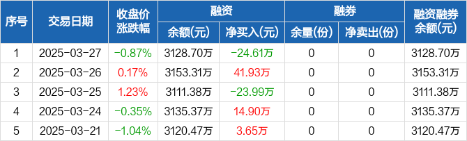 融资方面,当日融资买入166.16万元,融资偿还190.77万元,融资净偿还24.61万元。融券方面,融券卖出0份,融券偿还0份,融券余量0份,融券余额0元。融资融券余额合计3128.7万元。