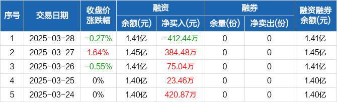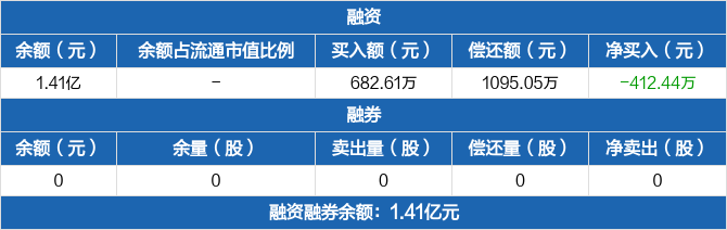 融资方面,当日融资买入682.61万元,融资偿还1095.05万元,融资净偿还412.44万元。融券方面,融券卖出0份,融券偿还0份,融券余量0份,融券余额0元。融资融券余额合计1.41亿元。