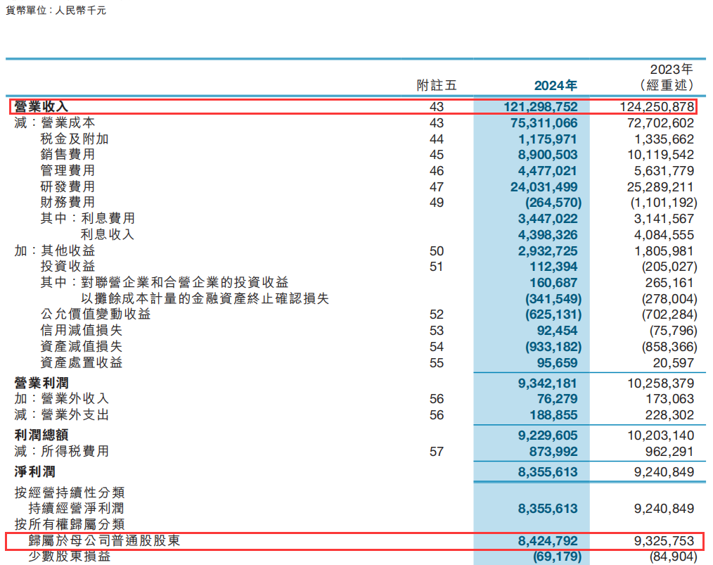 2024年,中兴通讯营收达1212.99亿元,同比微降2.38%,但较2018年增长42%。归母净利润84.25亿元,同比下降9.66%。