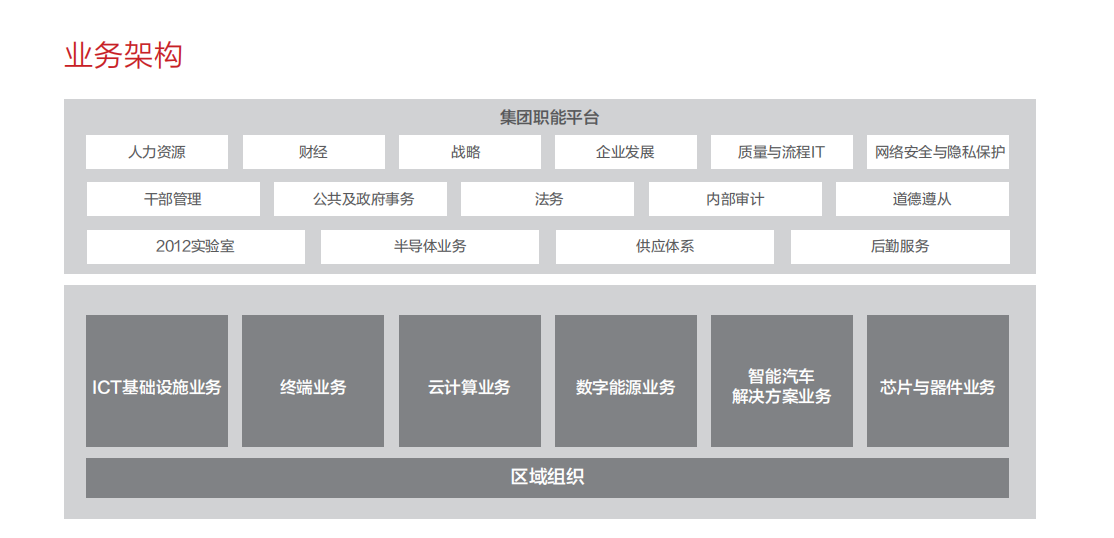 同时,公司架构上值得注意的是,华为在集团职能平台中新增了“半导体业务”,由海思升级而来,和2012实验室、供应体系等并列。对应的在区域组织,也就是核心六大产业上,将原先海思更名为“芯片与器件业务”,从中能看到华为的最新布局和技术实力。