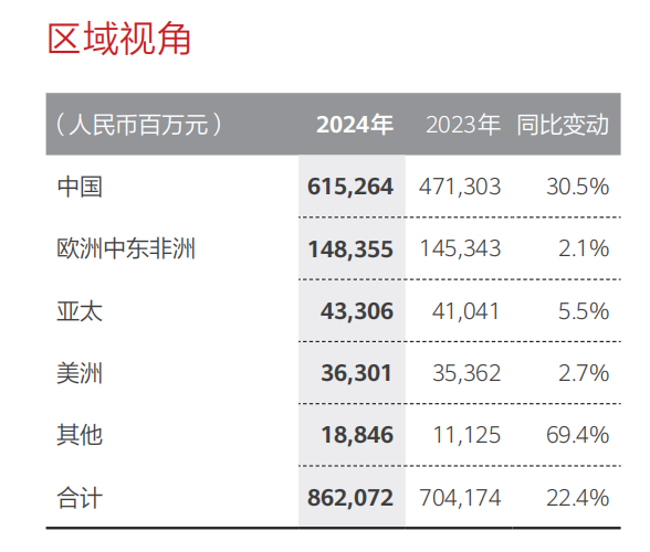 在各大业务线齐头并进的同时,华为在全球市场也在复苏。尤其是中国市场,2024年的营收同比增长了30.5%,占总营收比例的71%;欧洲中东非洲地区营收同比增长2.1%,占总营收比例的17%;亚太和美洲地区营收分别增长了5.5%、2.7%。