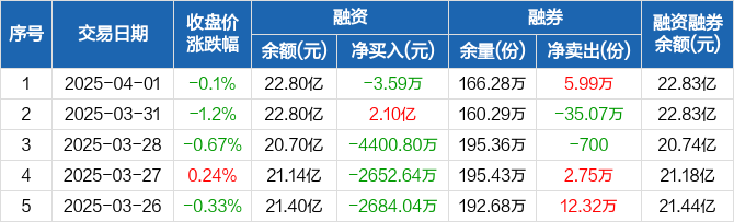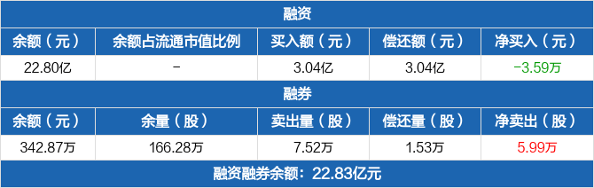 融资方面,当日融资买入3.04亿元,融资偿还3.04亿元,融资净偿还3.59万元。融券方面,融券卖出7.52万份,融券偿还1.53万份,融券余量166.28万份,融券余额342.87万元。融资融券余额合计22.83亿元。