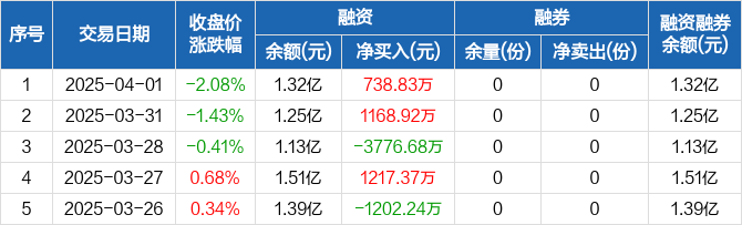 融资方面,当日融资买入4078.47万元,融资偿还3339.64万元,融资净买入738.83万元。融券方面,融券卖出0份,融券偿还0份,融券余量0份,融券余额0元。融资融券余额合计1.32亿元。