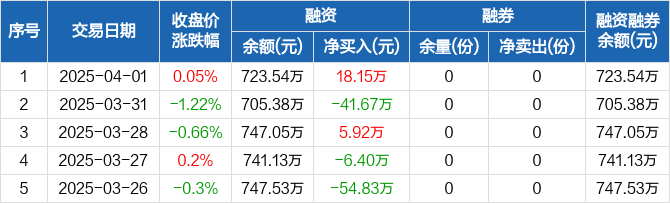 融资方面,当日融资买入55.92万元,融资偿还37.76万元,融资净买入18.15万元。融券方面,融券卖出0份,融券偿还0份,融券余量0份,融券余额0元。融资融券余额合计723.54万元。