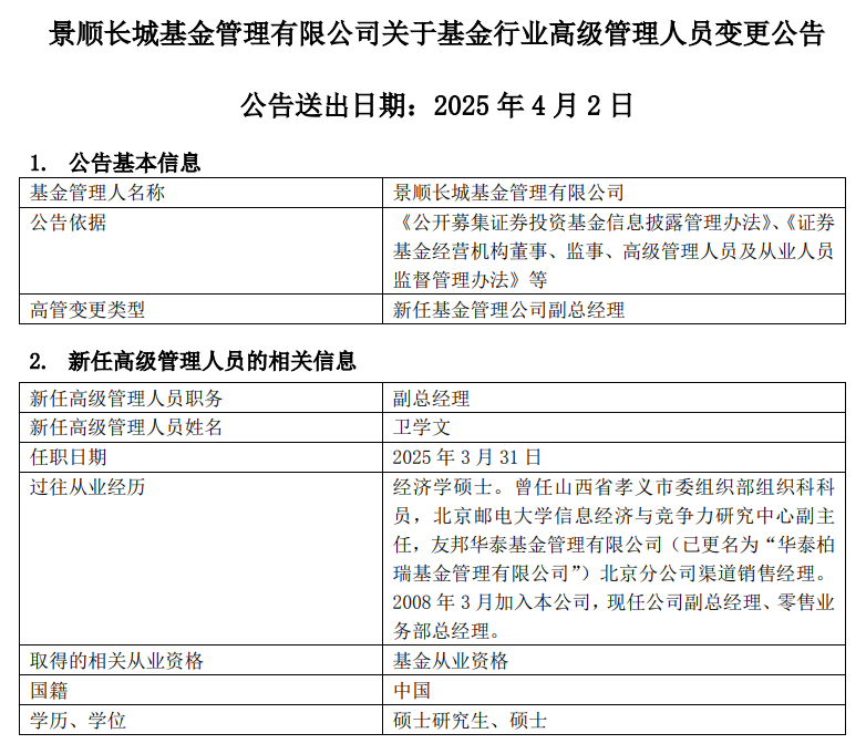 4月2日,景顺长城基金管理有限公司发布高级管理人员变更公告,公告显示,卫学文自2025年3月31日起正式担任公司副总经理,同时兼任零售业务部总经理。相关变更事项已通过公司董事会审议,并将按规定履行备案程序。