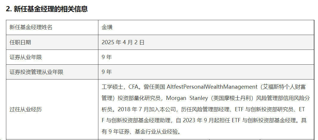 资料显示,金璜,工学硕士,CFA,曾任美国艾福斯特个人财富管理投资部量化研究员,美国摩根士丹利风险管理部信用风险分析员,2018年7月加入景顺长城,历任风险管理部经理、ETF与创新投资部研究员、ETF与创新投资部基金经理助理,自2023年9月起担任 ETF 与创新投资部基金经理。