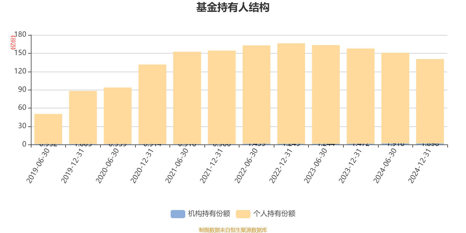 截至2024年12月31日,基金持有人共计72.53万户,合计持有140.43亿份。其中管理人员工持有2494.32万份,占比0.18%,机构持有份额占比1.35%,个人投资者占比98.65%。