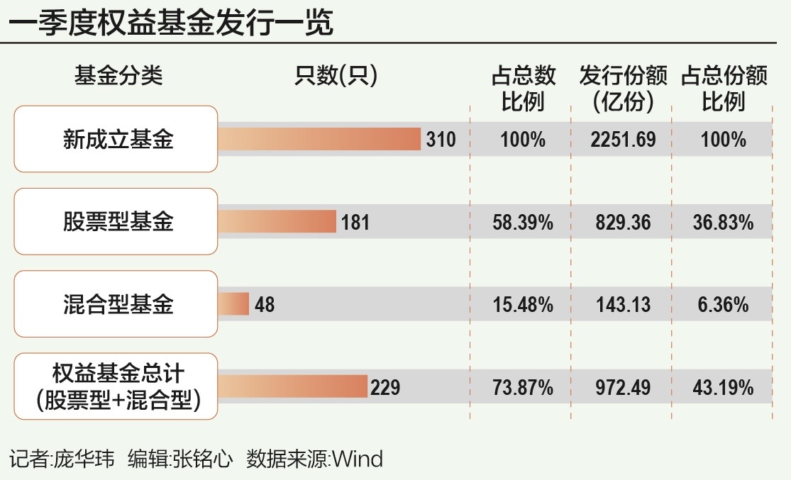 2025年一季度,共计229只权益基金(股票型+混合型基金,下同)成立,创近三年(2022年二季度以来)单季新高,占一季度新基金总数310只的近四分之三,为73.87%,这一比例也是近九年来的单季新高。