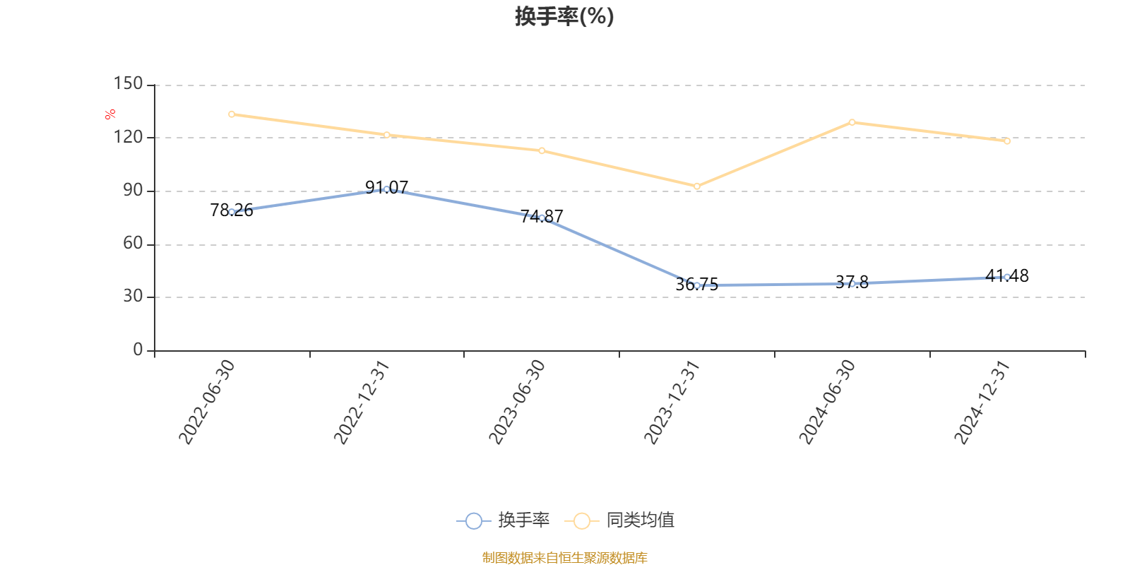 截至2024年12月31日,基金最近一年换手率约78.56%,持续低于同类均值。