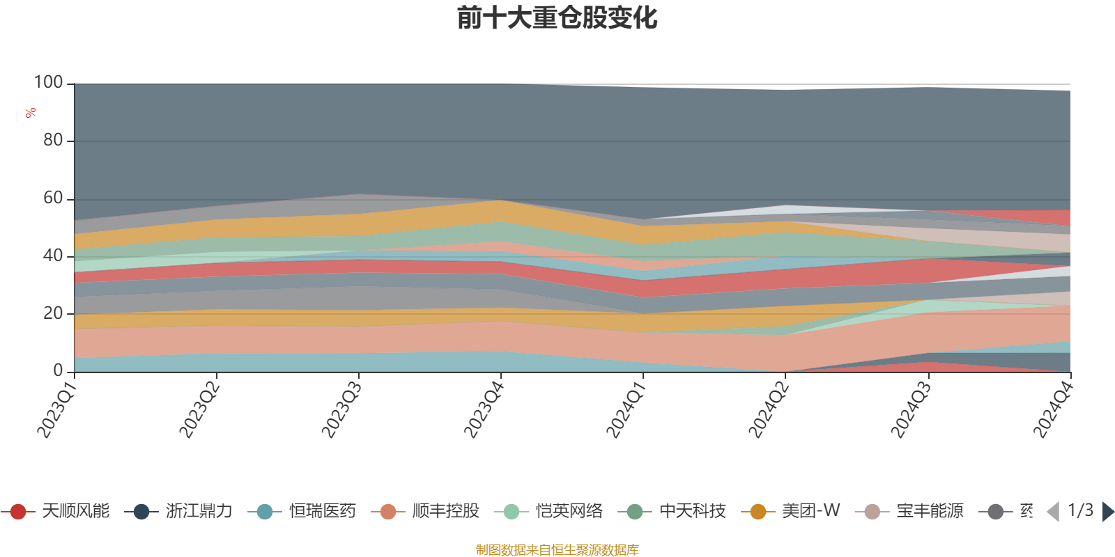 该基金持股集中度较高。截至2024年末,基金十大重仓股分别是顺丰控股、浙江鼎力、金山办公、泰格医药、腾讯控股、宝丰能源、舜宇光学科技、恒瑞医药、生益科技、药明康德。