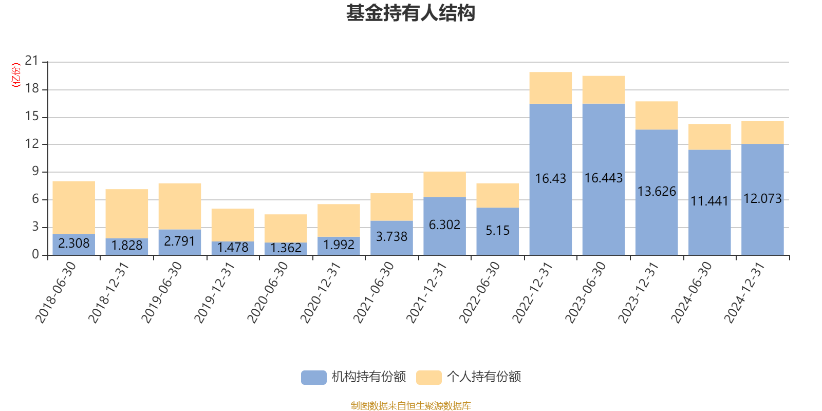 截至2024年12月31日,基金持有人共计1.96万户,合计持有14.54亿份。其中管理人员工持有511.65万份,占比0.35%,机构持有份额占比83.05%,个人投资者占比16.95%。