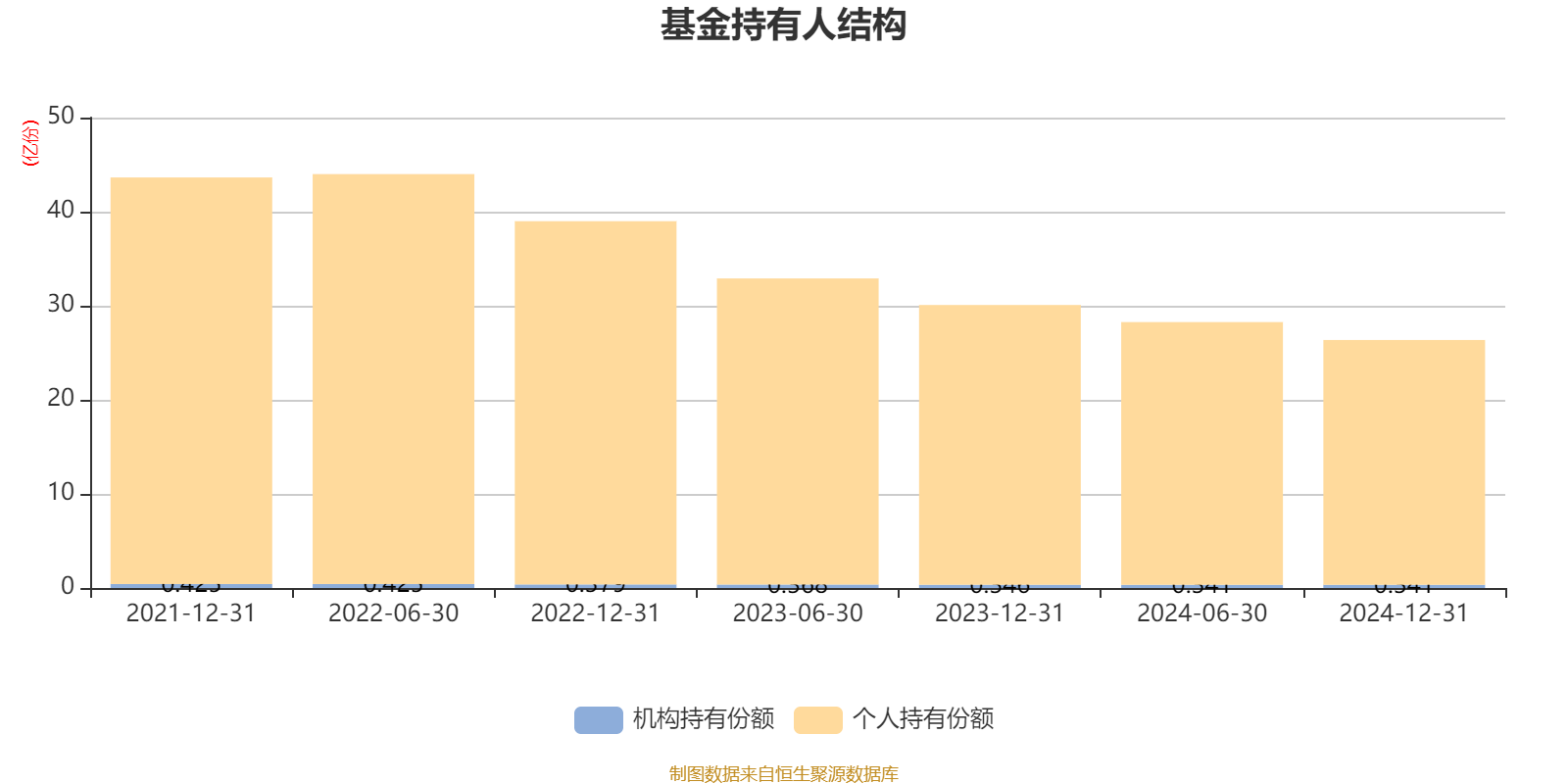 截至2024年12月31日,基金持有人共计3.8万户,合计持有26.36亿份。其中管理人员工持有369.48万份,占比0.14%,机构持有份额占比1.30%,个人投资者占比98.70%。