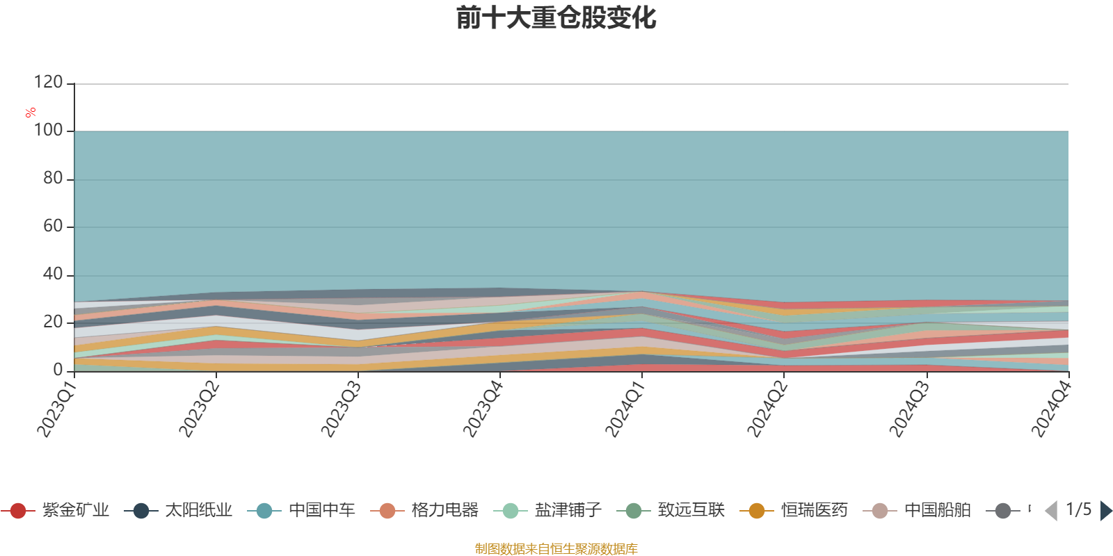 截至2024年末,基金十大重仓股分别是长江电力、宁德时代、美的集团、正帆科技、双环传动、格力电器、中国中车、立讯精密、盐津铺子、航发动力。
