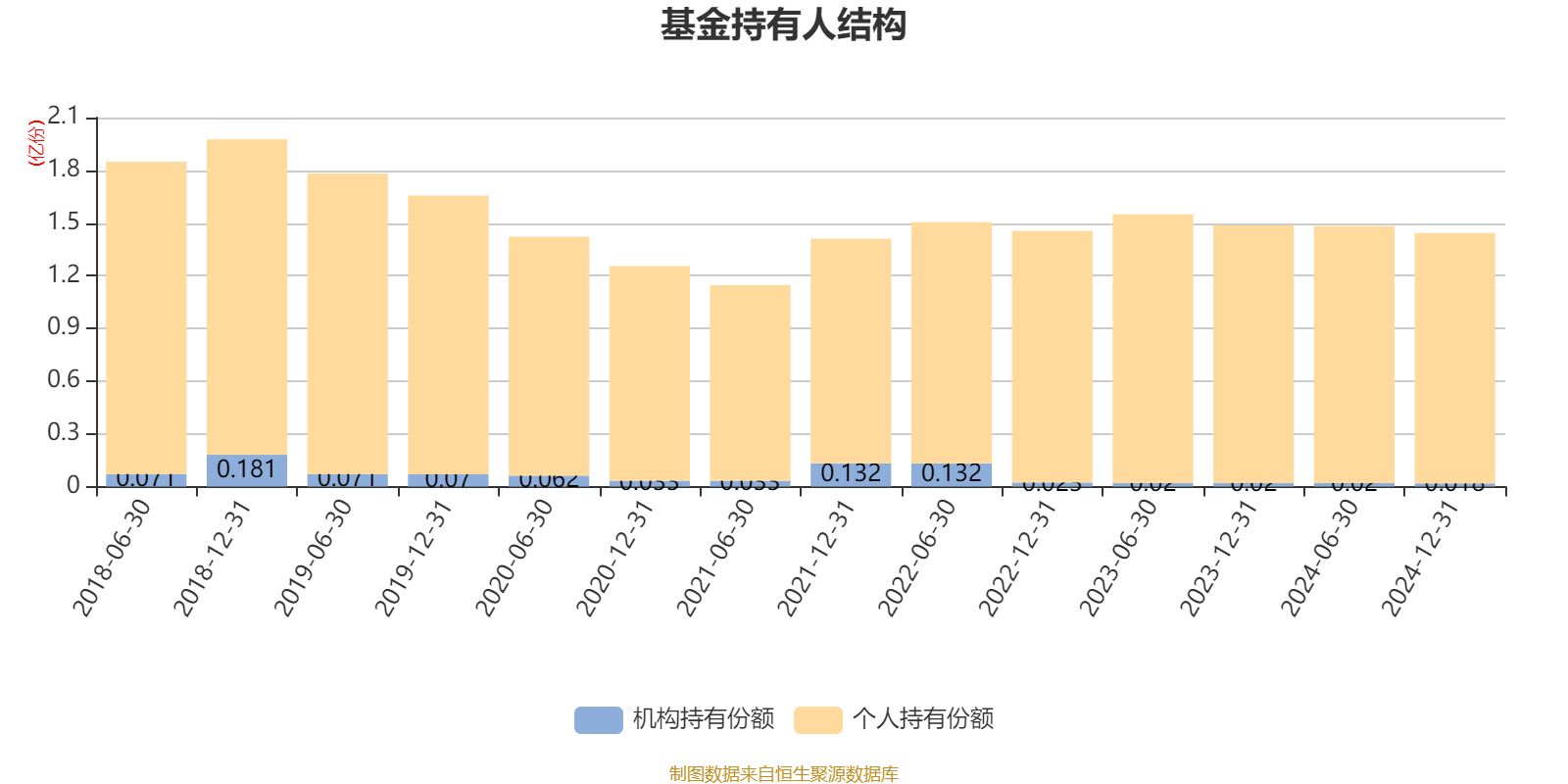 截至2024年12月31日,基金持有人共计4.29万户,合计持有1.44亿份。其中管理人员工持有8.68万份,占比0.06%,机构持有份额占比1.27%,个人投资者占比98.73%。