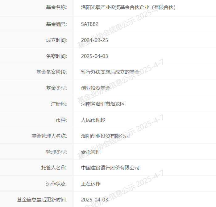 【大河财立方消息】4月7日消息,洛阳光联产业投资基金合伙企业(有限合伙)日前在中基协完成备案,基金管理人为洛阳创业投资有限公司。