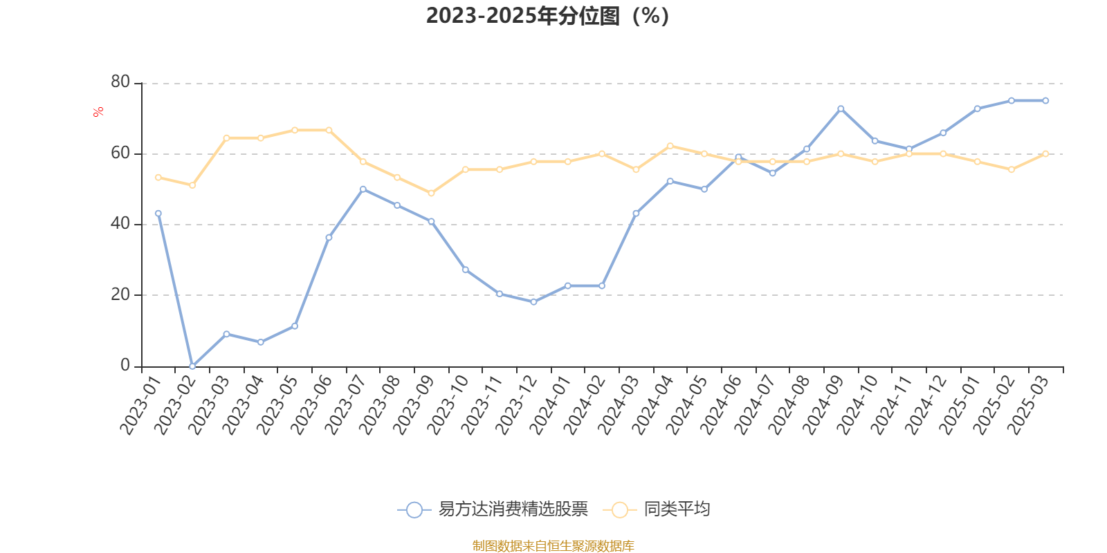 通过所选区间该基金净值增长率分位图,可以观察该基金与同类基金业绩比较情况。图为坐标原点到区间内某时点的净值增长率在同类基金中的分位数。