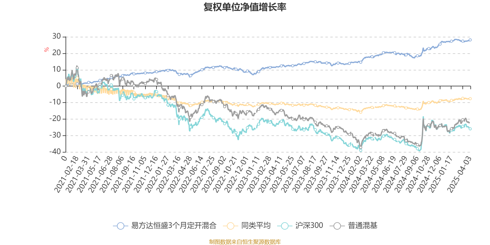 截至4月3日,易方达恒盛3个月定开混合近三个月复权单位净值增长率为0.79%,位于同类可比基金382/670;近半年复权单位净值增长率为4.81%,位于同类可比基金74/670;近一年复权单位净值增长率为8.07%,位于同类可比基金114/667;近三年复权单位净值增长率为19.02%,位于同类可比基金9/559。