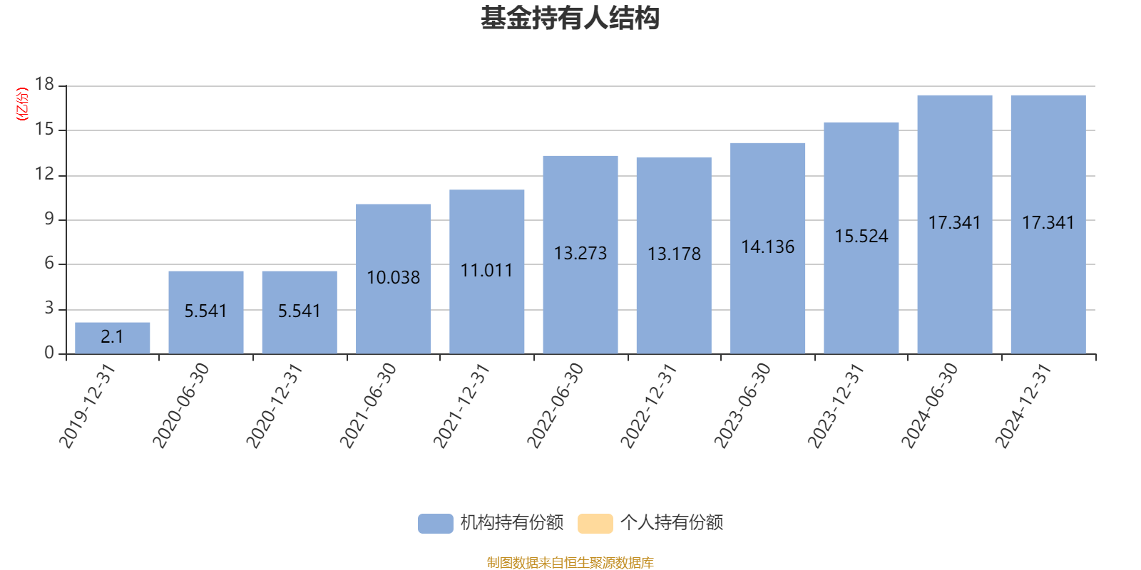 截至2024年12月31日,基金持有人共计212户,合计持有17.34亿份。其中管理人员工持有0份,机构持有份额占比100.00%,个人投资者占比0.00%。