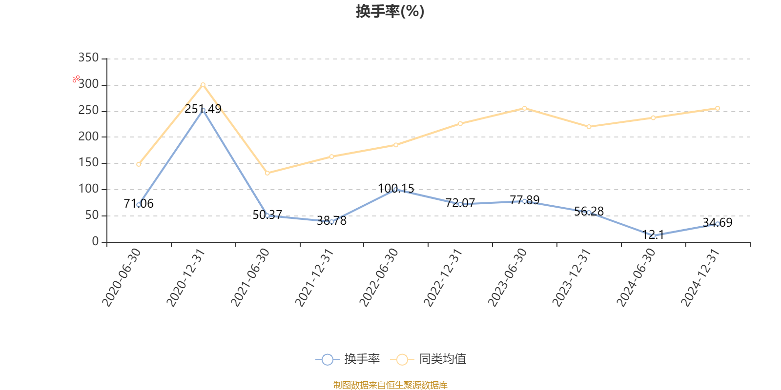截至2024年12月31日,基金最近一年换手率约46.66%,持续低于同类均值。