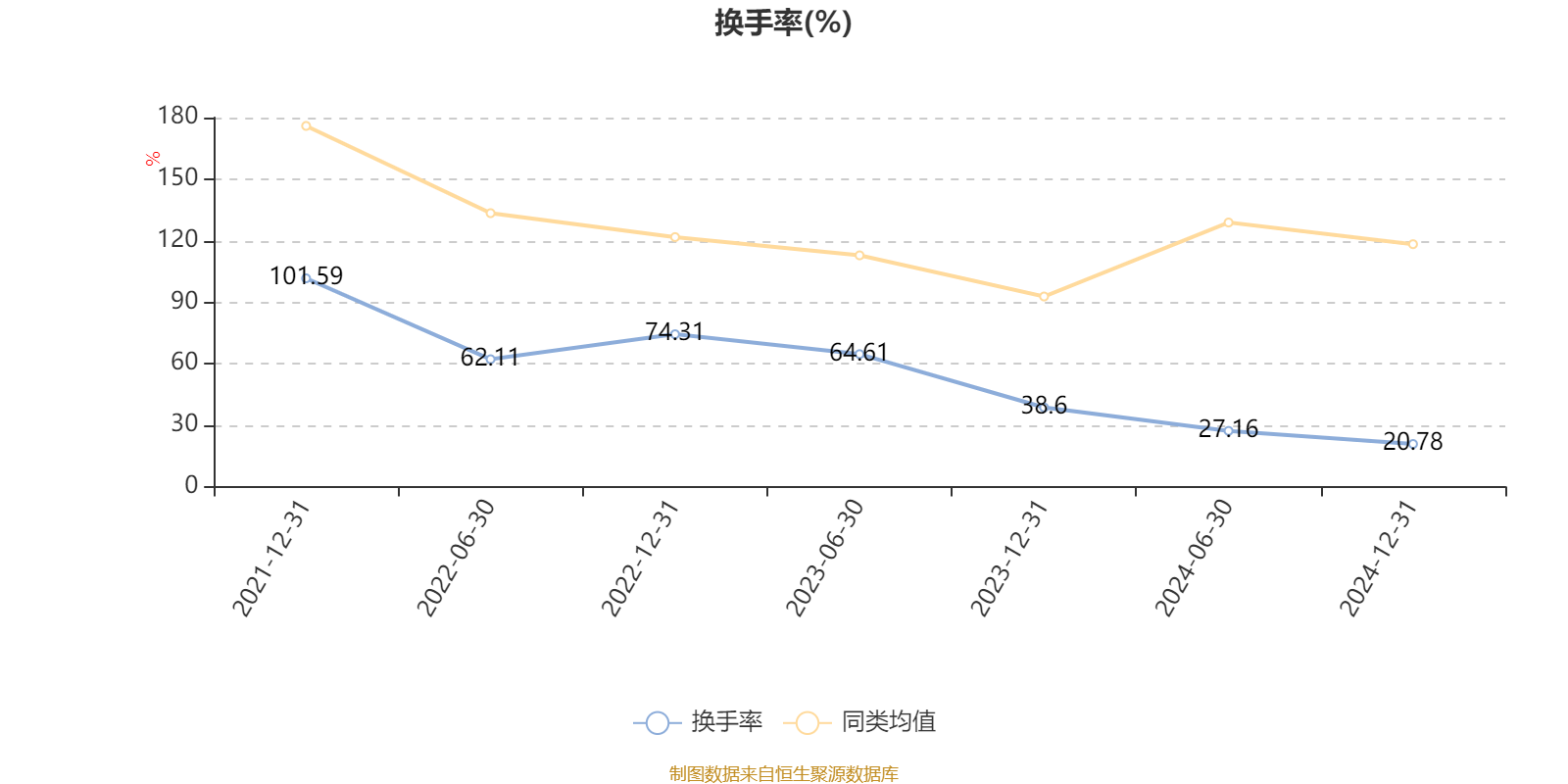 截至2024年12月31日,基金最近一年换手率约48.08%,持续低于同类均值。