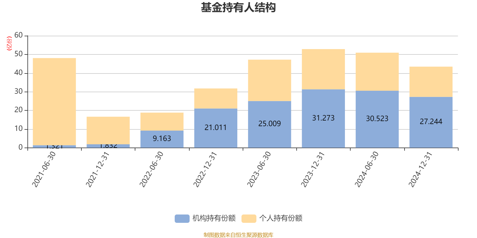 截至2024年12月31日,基金持有人共计5.26万户,合计持有43.43亿份。其中管理人员工持有483.81万份,占比0.11%,机构持有份额占比62.73%,个人投资者占比37.27%。