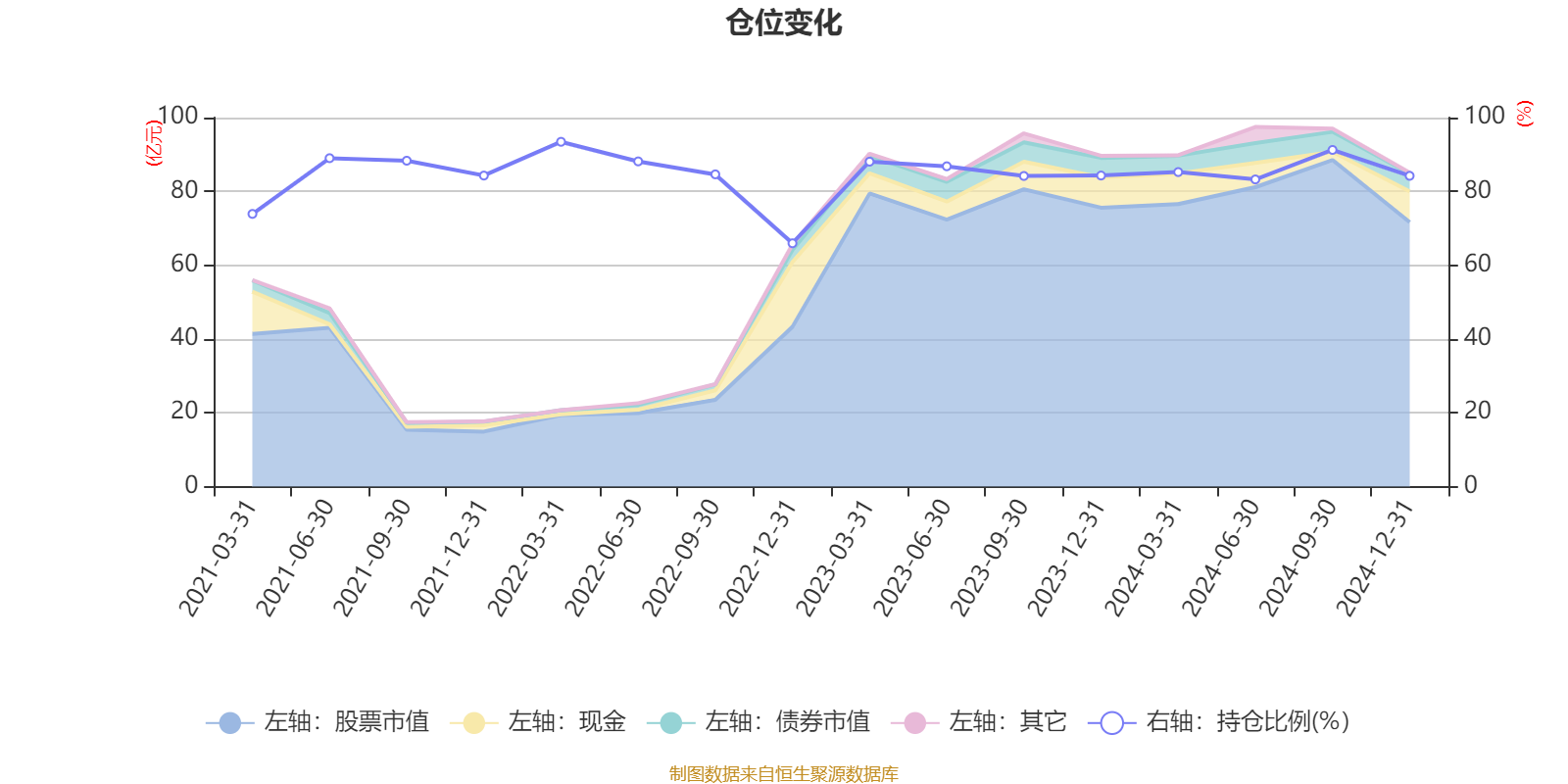 据定期报告数据统计,近三年平均股票仓位为84.95%,同类平均为83.58%。2022年一季度末基金达到93.44%的最高仓位,2022年末最低,为65.94%。