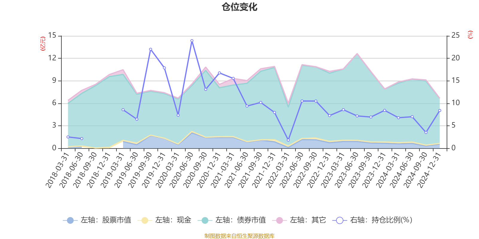 据定期报告数据统计,近三年平均股票仓位为7.26%,同类平均为18.51%。2020年上半年末基金达到23.93%的最高仓位,2022年一季度末最低,为1.83%。