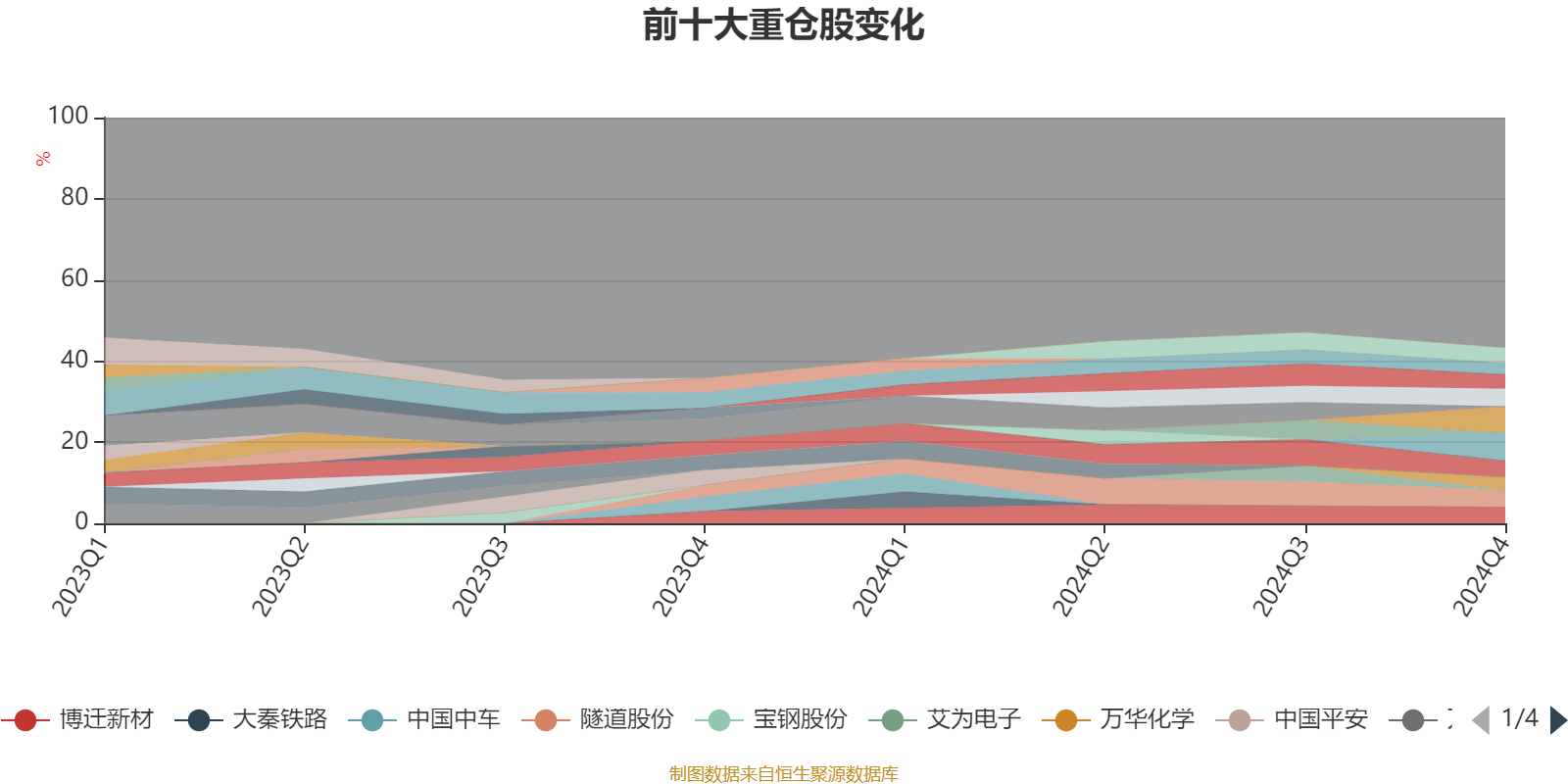 截至2024年末,基金十大重仓股分别是隆基绿能、桐昆股份、海泰新光、隧道股份、海螺水泥、博迁新材、广深铁路、新宙邦、万华化学、中国天楹。