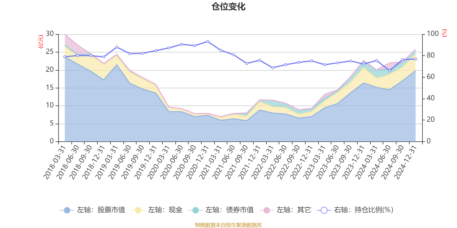 据定期报告数据统计,近三年平均股票仓位为73%,同类平均为79.88%。2020年末基金达到93.23%的最高仓位,2024年上半年末最低,为66%。