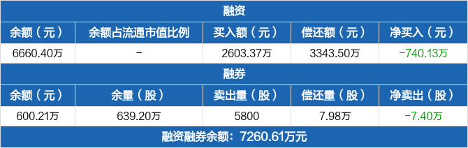 融资方面,当日融资买入2603.37万元,融资偿还3343.5万元,融资净偿还740.13万元。融券方面,融券卖出5800份,融券偿还7.98万份,融券余量639.2万份,融券余额600.21万元。融资融券余额合计7260.61万元。