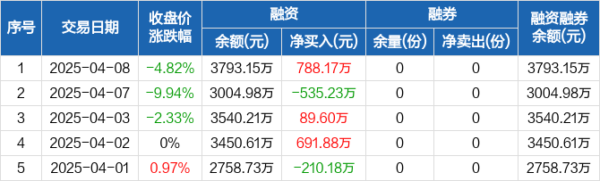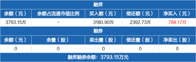 融资方面,当日融资买入3180.9万元,融资偿还2392.73万元,融资净买入788.17万元。融券方面,融券卖出0份,融券偿还0份,融券余量0份,融券余额0元。融资融券余额合计3793.15万元。