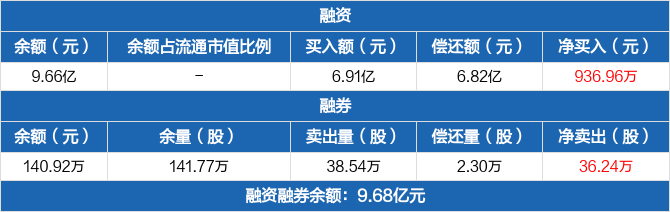 融资方面,当日融资买入6.91亿元,融资偿还6.82亿元,融资净买入936.96万元。融券方面,融券卖出38.54万份,融券偿还2.3万份,融券余量141.77万份,融券余额140.92万元。融资融券余额合计9.68亿元。