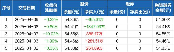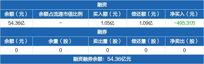 融资方面,当日融资买入1.05亿元,融资偿还1.09亿元,融资净偿还495.31万元。融券方面,融券卖出0份,融券偿还0份,融券余量0份,融券余额0元。融资融券余额合计54.36亿元。