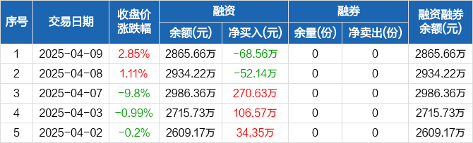 融资方面,当日融资买入178.32万元,融资偿还246.88万元,融资净偿还68.56万元。融券方面,融券卖出0份,融券偿还0份,融券余量0份,融券余额0元。融资融券余额合计2865.66万元。