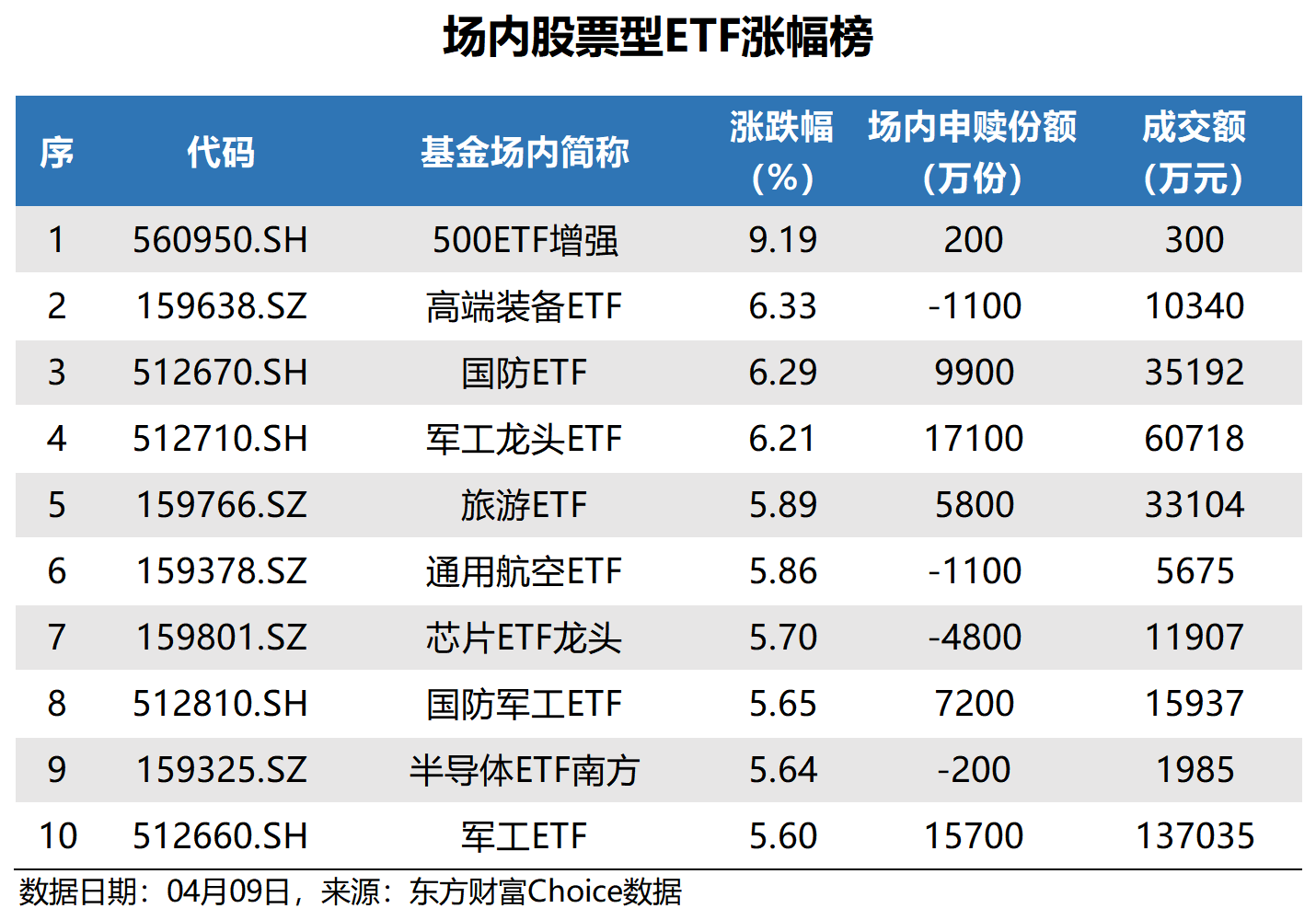 数据显示,昨日场内股票型ETF中,500ETF增强、高端装备ETF、国防ETF涨幅居前。其中,500ETF增强涨幅最大,达9.19%。