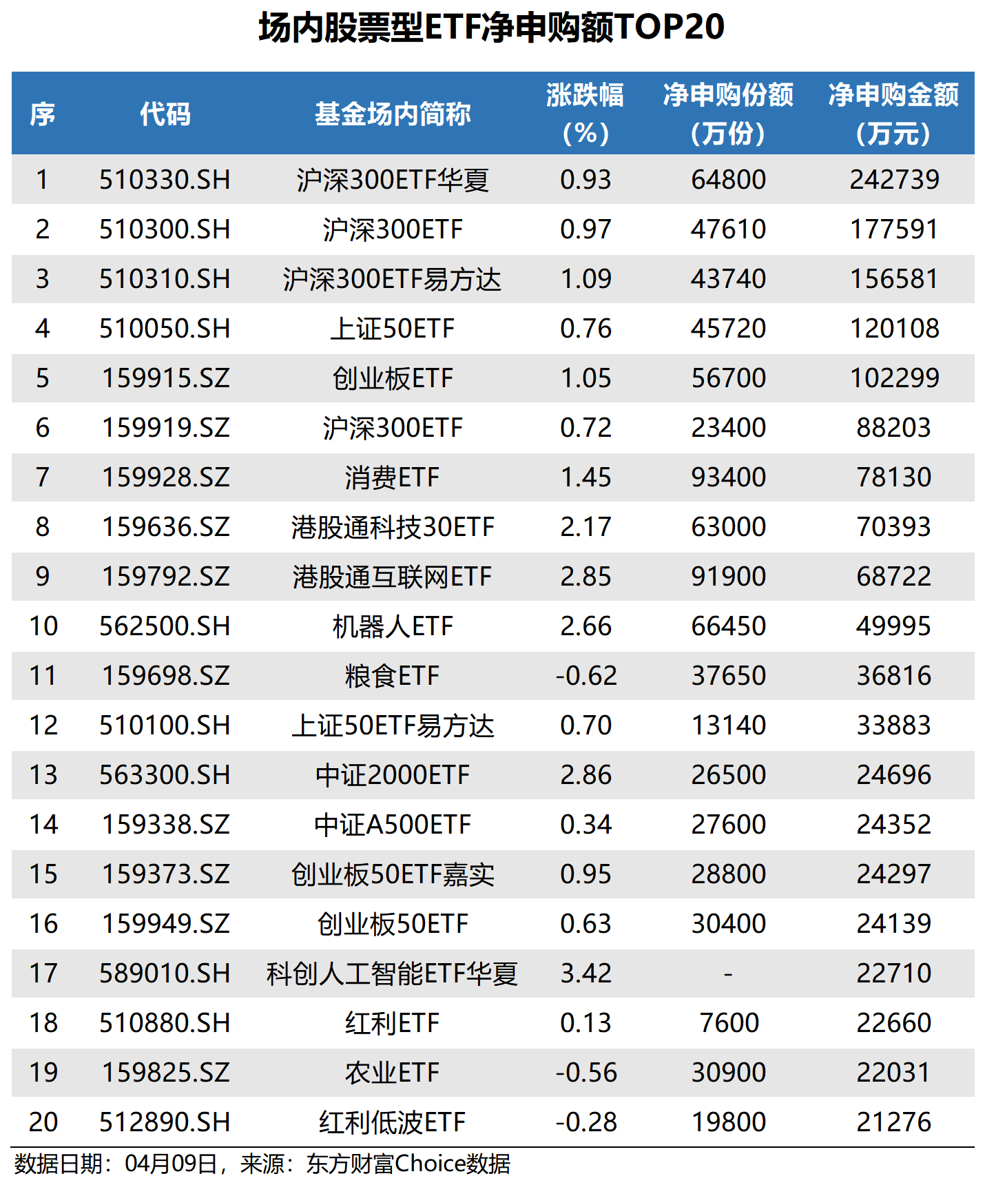 昨日(4月9日),东方财富Choice数据显示,场内股票型ETF净申购71.52亿份;其中,沪市股票型ETF净申购21.11亿份,深市股票型ETF净申购50.41亿份。以最新净值计,昨日市场净申购121.75亿元。