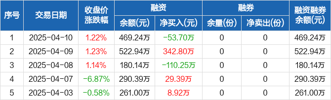 融资方面,当日融资买入231.54万元,融资偿还285.24万元,融资净偿还53.7万元。融券方面,融券卖出0份,融券偿还0份,融券余量0份,融券余额0元。融资融券余额合计469.24万元。