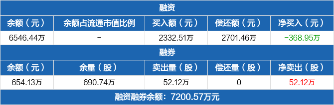 融资方面,当日融资买入2332.51万元,融资偿还2701.46万元,融资净偿还368.95万元。融券方面,融券卖出52.12万份,融券偿还0份,融券余量690.74万份,融券余额654.13万元。融资融券余额合计7200.57万元。