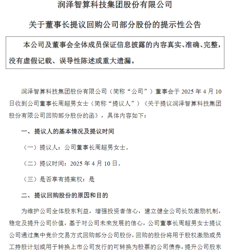 4月10日,润泽科技(300442)公司董事长周超男提议通过集中竞价交易方式回购5亿-10亿元公司股份,用于股权激励、员工持股计划或可转债转换,旨在提升股东价值并强化市场信心。