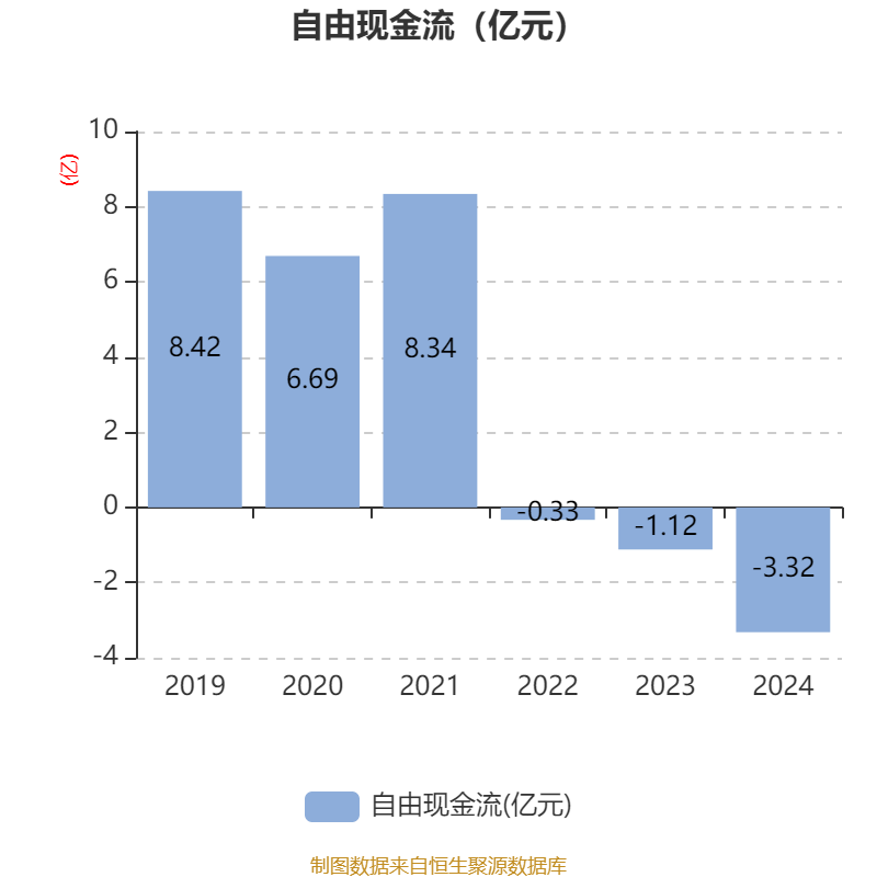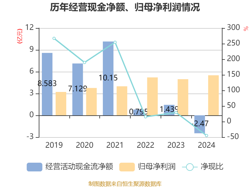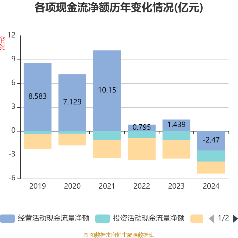 截至2024年,公司经营活动现金流净额为-2.47亿元,同比减少3.91亿元;筹资活动现金流净额-1.51亿元,同比增加7905.23万元;投资活动现金流净额-1.4亿元,上年同期为-1.18亿元。