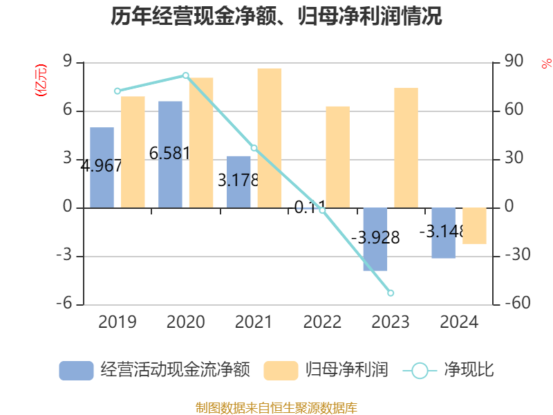 截至2024年,公司经营活动现金流净额为-3.15亿元,同比增加7805.52万元;筹资活动现金流净额-4.2亿元,同比减少41.4亿元;投资活动现金流净额-22.51亿元,上年同期为2.85亿元。