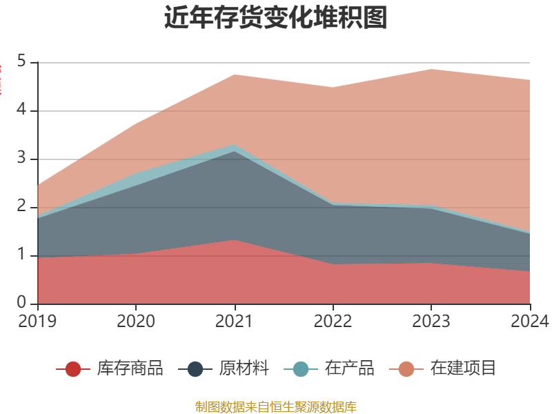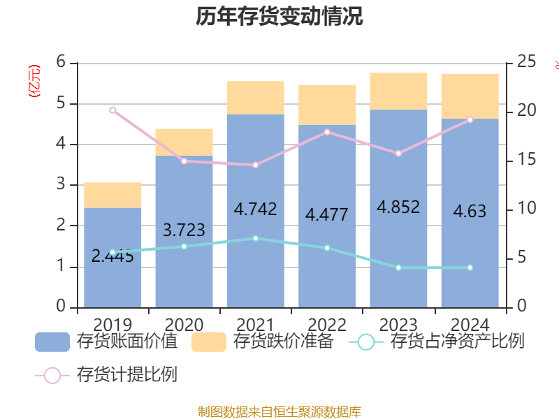 从存货变动来看,截至2024年末,公司存货账面价值为4.63亿元,占净资产的4.06%,较上年末减少2223.41万元。其中,存货跌价准备为1.1亿元,计提比例为19.19%。