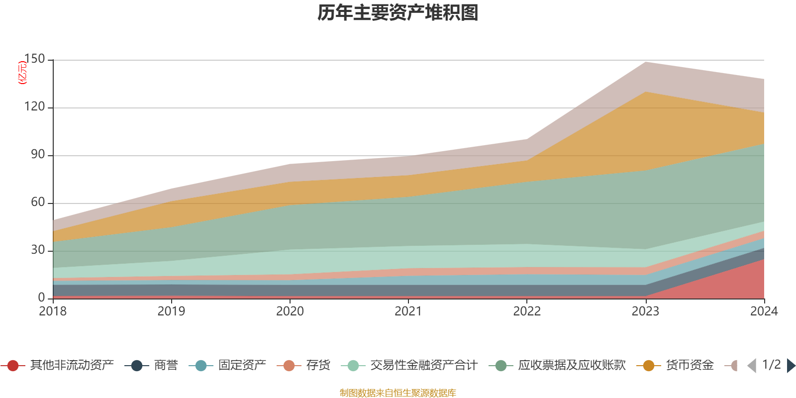 资产重大变化方面,截至2024年末,公司货币资金较上年末减少60.34%,占公司总资产比重下降19.06个百分点;其他非流动资产较上年末增加1546.02%,占公司总资产比重上升16.91个百分点;交易性金融资产合计较上年末减少48.89%,占公司总资产比重下降3.4个百分点;应收票据及应收账款较上年末减少1.2%,占公司总资产比重上升2.19个百分点。