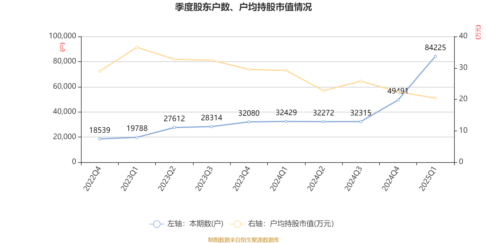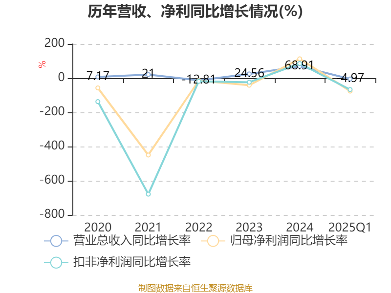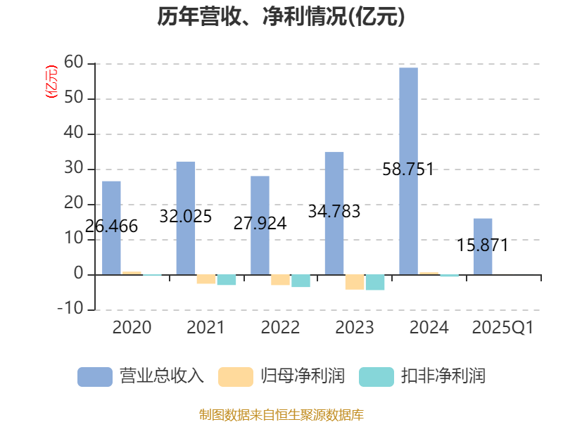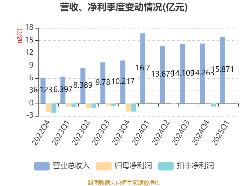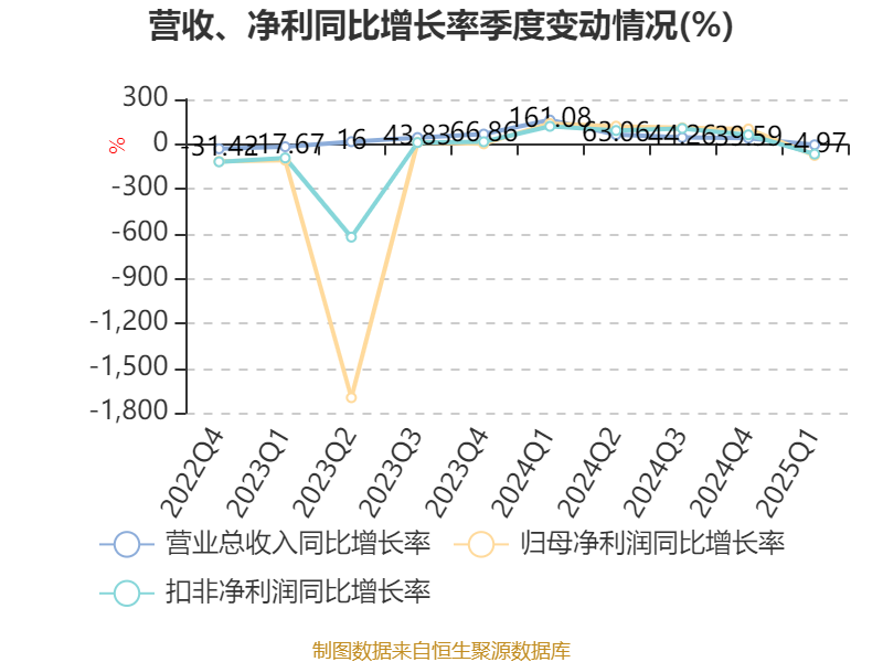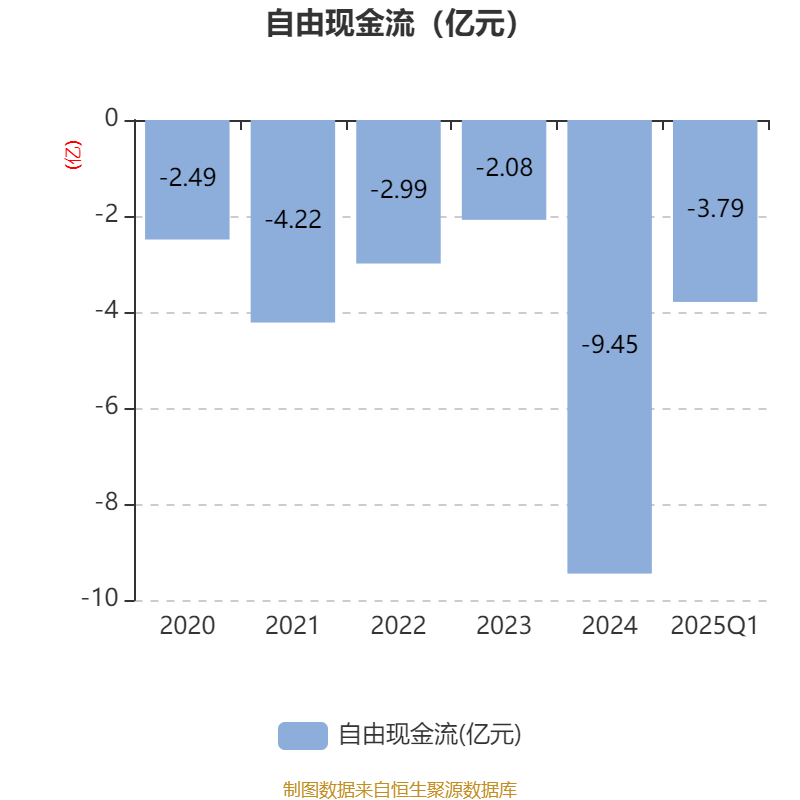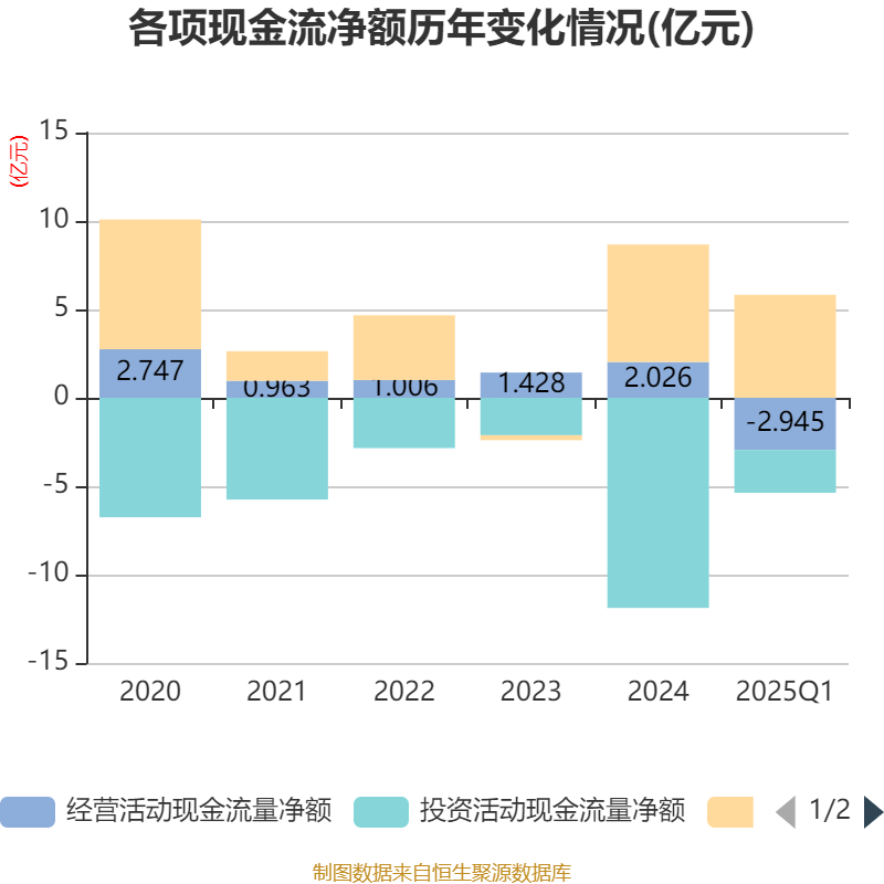 截至2025年一季度末,公司经营活动现金流净额为-2.95亿元,同比减少1.4亿元;筹资活动现金流净额5.83亿元,同比增加6.34亿元;投资活动现金流净额-2.43亿元,上年同期为-2026.63万元。