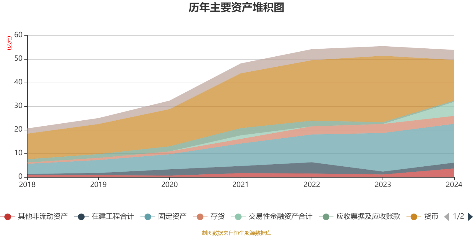 资产重大变化方面,截至2024年末,公司货币资金较上年末减少38.63%,占公司总资产比重下降18.66个百分点;交易性金融资产合计占公司总资产的11.02%,上年末为0;其他非流动资产较上年末增加237.55%,占公司总资产比重上升4.78个百分点;在建工程合计较上年末增加99.67%,占公司总资产比重上升2.33个百分点。