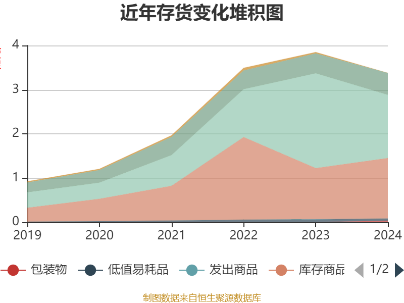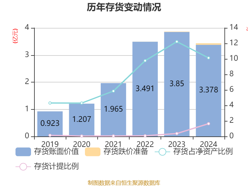 从存货变动来看,截至2024年末,公司存货账面价值为3.38亿元,占净资产的10.13%,较上年末减少4720.98万元。其中,存货跌价准备为564.76万元,计提比例为1.64%。