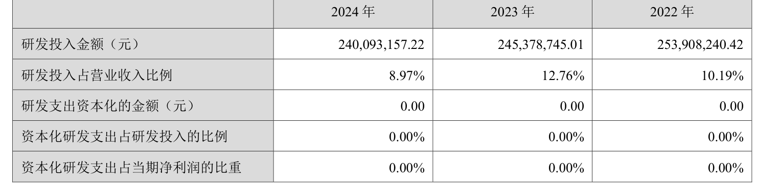 2024年全年,公司研发投入金额为2.4亿元,同比下降2.15%;研发投入占营业收入比例为8.97%,相比上年同期下降3.79个百分点。此外,公司全年研发投入资本化率为0%。