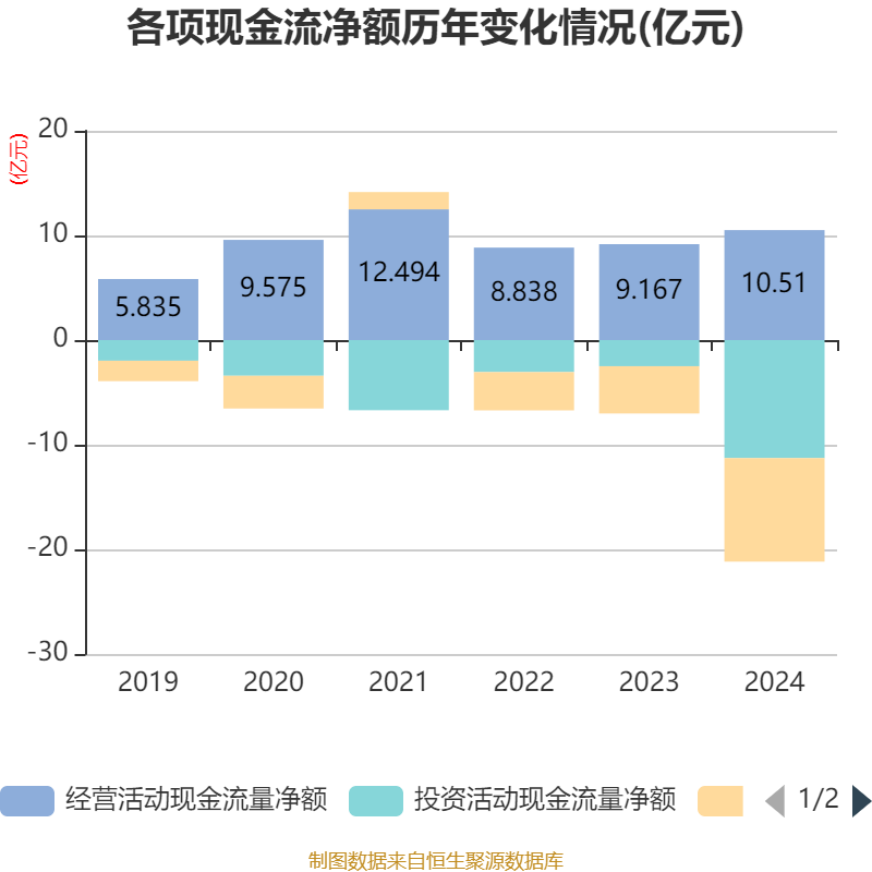 截至2024年,公司经营活动现金流净额为10.51亿元,同比增长14.64%;筹资活动现金流净额-9.9亿元,同比减少5.38亿元;投资活动现金流净额-11.27亿元,上年同期为-2.5亿元。